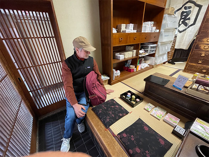小さな喫茶店を想像して中に入ってみてびっくり。昔ながらに座って商いをするお店でした。何と和菓子を作り続けて100年以上するとか。ジョン・クロードの前に、その日に購入できる和菓子がお盆の中に並んでいます。