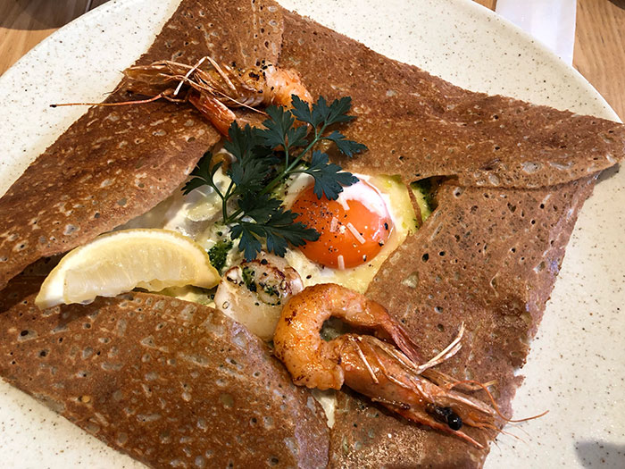 私が注文したのは、その日のお昼のセットで海の幸のガレット。貝がちょっと固かったけれど、やっぱりとても美味しくて満足。ガレットのカリカリ感がわかりますか?!