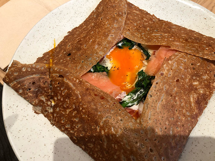 ジョン・クロードが注文したのはいつものサーモンのガレット。ほうれん草やトマトも入っていて、うまうま。
