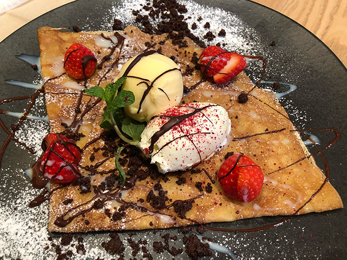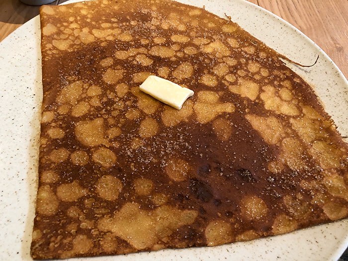 セットについてくるデザートは、いちばんベーシックなバターと砂糖のクレープ。家ではいつもこれを食べていたよ、とジョン・クロード。彼に少しだけ分けてあげると、フランスのクレープより美味しいかも!と。